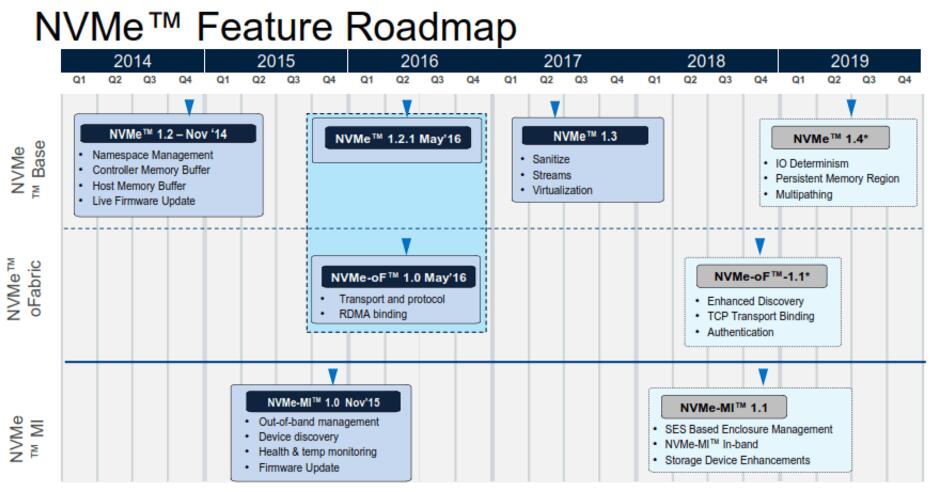 第一個(gè)NVMe規(guī)范逐漸增加了更新的功能——1.2版本中的實(shí)時(shí)固件更新和1.3版本中的清理功能已經(jīng)在SCSI和SATA中很常見了。明年年中推出NVMe 1.4版本將增加IO Determinism功能,以確?缇W(wǎng)絡(luò)和存儲(chǔ)的緊密且一致的延遲。同時(shí),新增的管理規(guī)范也提供了管理設(shè)備機(jī)箱的能力。
